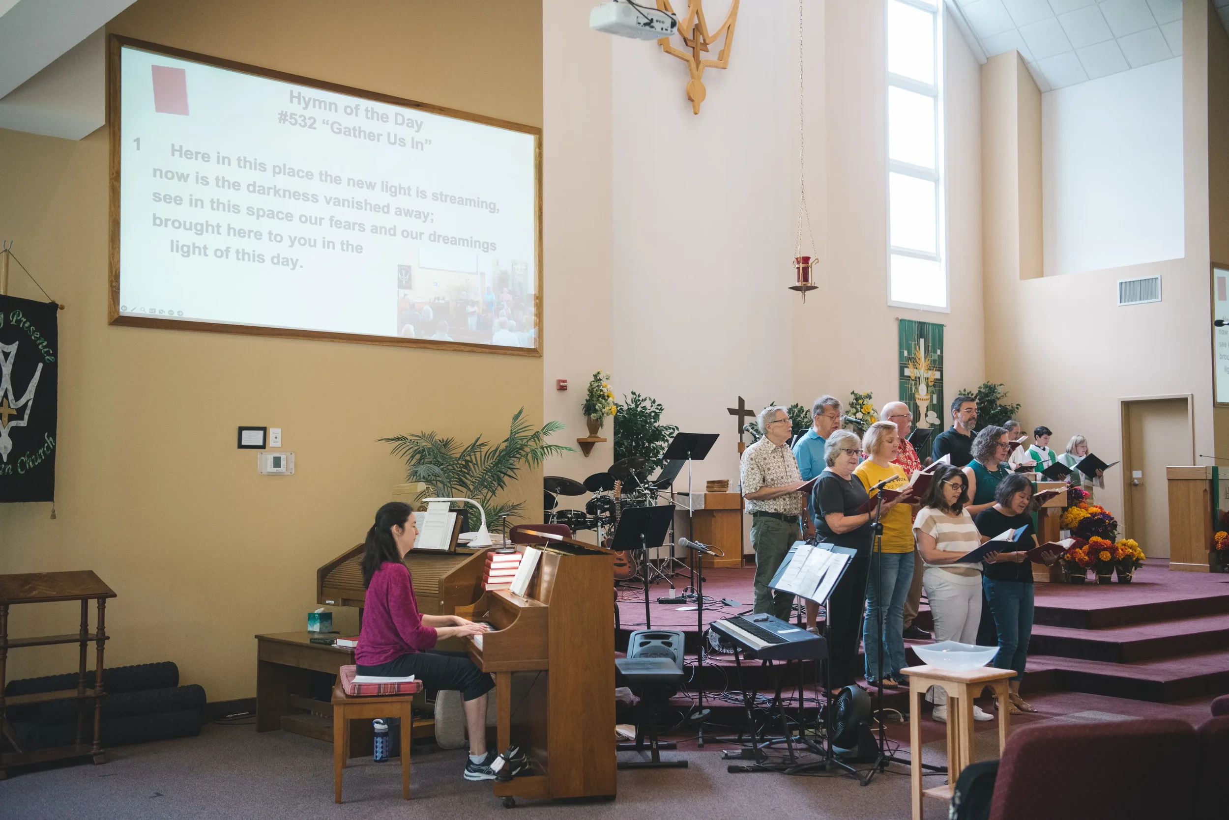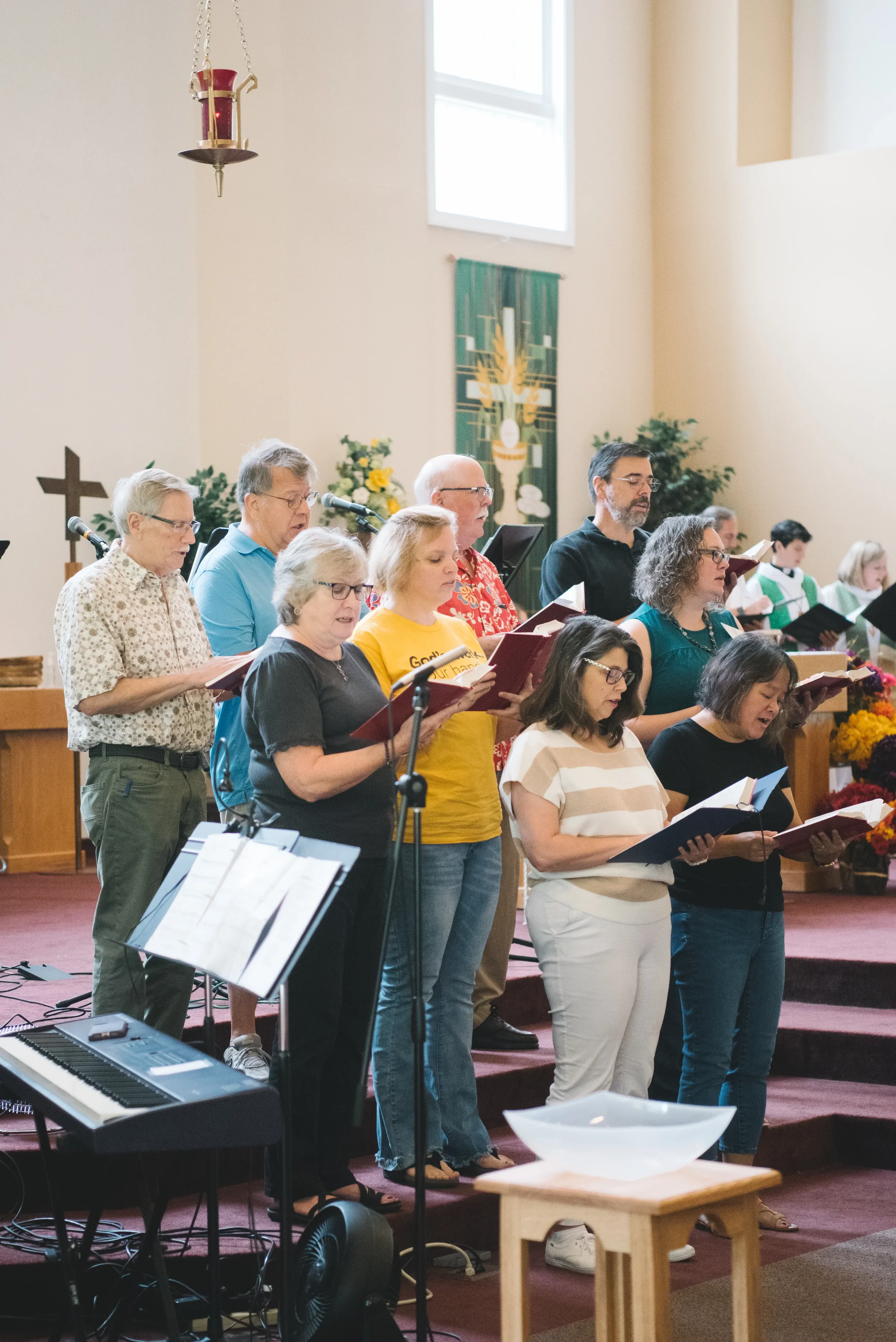 Praise Band leads contemporary songs in worship using guitars, drums, keyboard, singers, and other instruments as needed. Rehearsals happen on Sunday mornings.