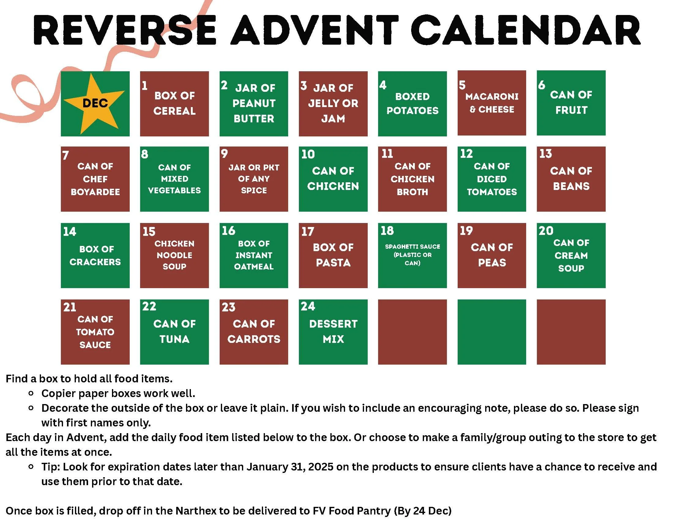 This year we invite you to participate in a reverse Advent Calendar. We will be collecting for the Fuquay Varina Food Pantry. You can either build a box all at once or each day add an item. Pastor Emily will have a calendar with the items to grab on Sunday, or you can Print a copy here. We will have some boxes on hand to grab if you need one. Feel free to decorate them if you'd like! As they are completed, place them in the Narthex and they will be delivered as they are received. We'd like to have all boxes no later than Christmas Eve. Contact Pastor Emily for more information.